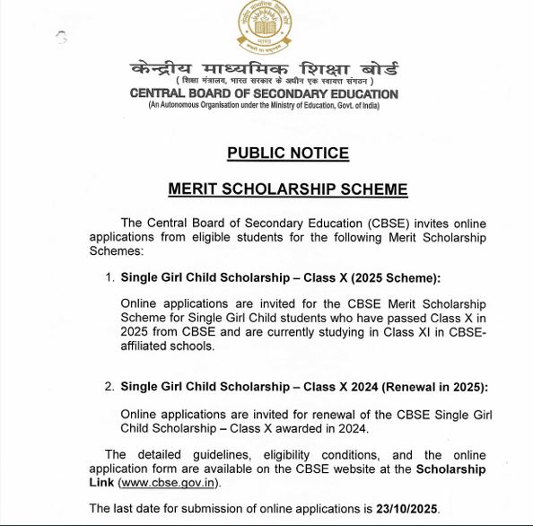 सीबीएसई मेरिट स्कॉलरशिप फॉर सिंगल गर्ल चाइल्ड 2025-26 – अंतिम तिथि