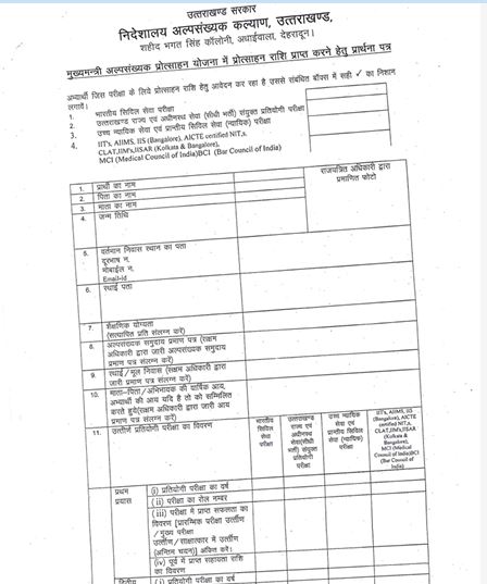 आवेदक को आवेदन फॉर्म जिले के अल्पसंख्यक कल्याण कार्यालय से प्राप्त करना होगा, या इसे https://minoritywelfare.uk.gov.in/ से डाउनलोड किया जा सकता है।