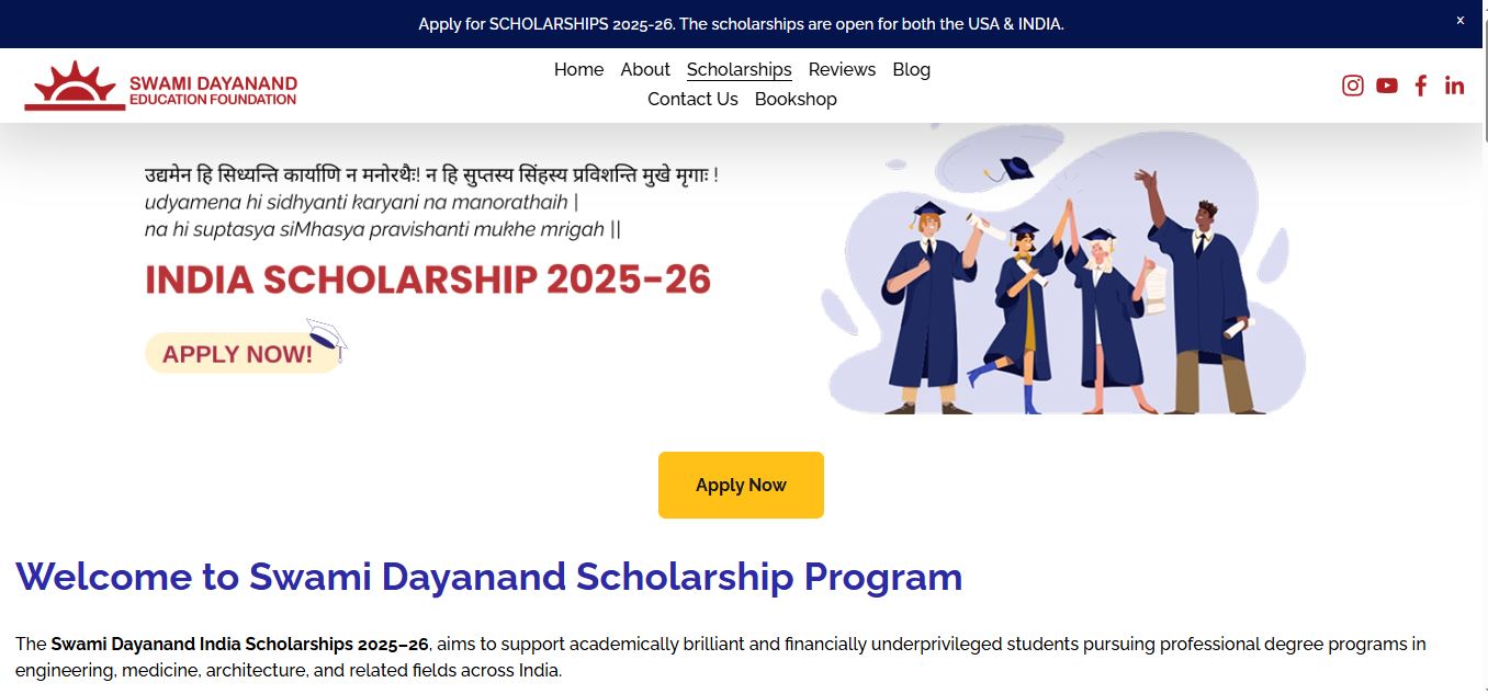 स्वामी दयानन्द इंडिया स्कॉलरशिप प्रोग्राम 2025-26: ऑनलाइन आवेदन